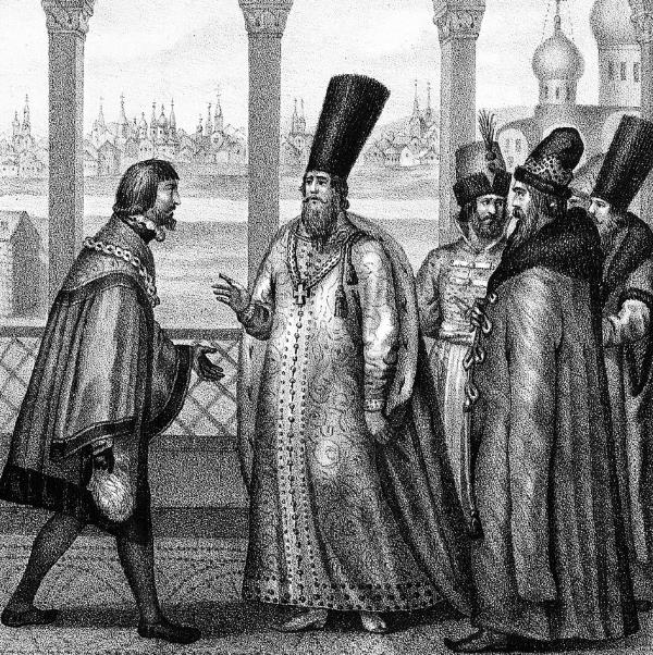 Спесивые против бедных мещан, дворяне и богатые купцы были гостеприимны и вежливы между собою. Гость, входя в комнату, глазами искал святых образов, шел к ним, крестился и, несколько раз сказав вслух: Господи помилуй! – обращался к хозяину с приветствием: Дай Боже тебе здравия! Они целовались, кланялись друг другу и чем ниже, тем лучше; переставали и снова начинали кланяться; садились, беседовали, и гость, взяв шапку, шел опять к образам; хозяин провожал его до крыльца, а любимого до самых ворот. Потчевали приятелей медом, пивом, винами иноземными: романеею, мушкателем, канарским, белым рейнским; лучшим считалась мальвазия, употребляемая, однако ж, более в лекарство и во дворце за великокняжескою трапезою. Ужинов не знали: обеды были изобильные и вкусные для самых иноземцев, которые дивились у нас множеству и дешевизне всякого скота, рыбы, птиц, дичины, добываемой охотою псовою, соколиною, тенетами. Вообще роскошь тогдашняя состояла в избытке обыкновенных, дешевых вещей; умели хвалиться ею, не разоряясь; бережливость не славилась добродетелью, ибо казалось естественною людям, которые еще не ведали прелестей изнеженного вкуса. Дорогие одежды означали первостепенных государственных сановников: если не закон, то обыкновение воспрещало другим равняться с ними в сих принадлежностях знатности, соединенной всегда с богатством. Сии наряды употреблялись бережно; ветреная мода не изменяла оных, и вельможа оставлял свою праздничную одежду в наследство сыну. Платье боярское, дворянское, купеческое не различалось покроем: верхнее с опушкою, широкое, длинное называлось однорядками; другое охабнями, с воротником; третье ферезями, с пуговицами до подола, с нашивками или без нашивок; такое же длинное, с нашивками или только с пуговицами до пояса, кунтышами, доломанами, кафтанами; у всякого были клинья, а на боках прорехи. Полукафтанье носили с козырем; рубахи с вышитым разноцветным воротником и с серебряною пуговицею; сапоги сафьянные, красные, с железными подковами; шапки высокие, шляпы поярковые, черные и белые. Мужчины стригли себе волосы. Дома не блистали внутренним украшением: самые богатые люди жили в голых стенах. Сени огромные, а двери низкие, и входящий всегда наклонялся, чтобы не удариться головою о верхний косяк.