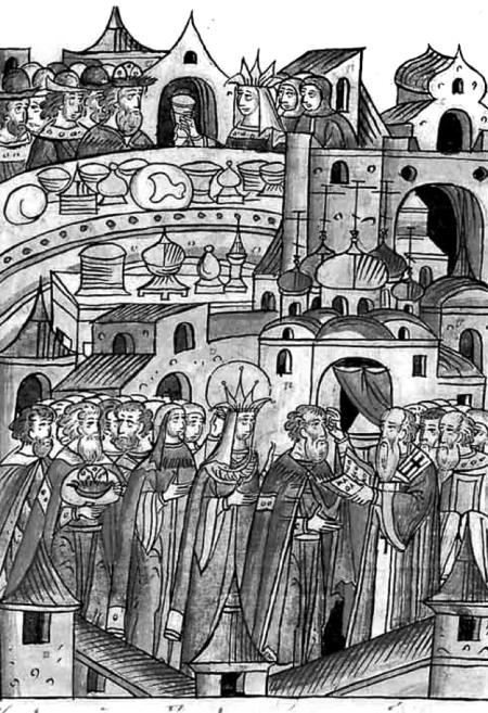 «Державный жених, нарядясь, сидел в брусяной столовой избе со своим поездом; а невеста, Елена Глинская, с женою тысяцкого, двумя свахами, боярынями и многими знатными людьми шла из дому в середнюю палату. Перед нею несли две брачные свечи в фонарях, два каравая и серебряные деньги. В сей палате были сделаны два места, одетые бархатом и камками; на них лежали два зголовья и два сорока черных соболей; а третьим сороком надлежало опахивать жениха и невесту. На столе, покрытом скатертью, стояло блюдо с калачами и солью. Елена села на своем месте; сестра ее, княжна Анастасия, на жениховом; боярыни вокруг стола. Василий прислал туда брата, князя Юрия, который, заняв большое место, велел звать жениха. Государь! сказали ему: иди с Богом на дело. Великий князь вошел с тысяцким и со всеми чиновниками, поклонился иконам, свел княжну Анастасию со своего места и сел на оное. Читали молитву. Жена тысяцкого гребнем чесала голову Василию и Елене. Свечами богоявленскими зажгли брачные, обогнутые соболями и вдетые в кольца. Невесте подали кику и фату. На золотой мисе, в трех углах, лежали хмель, соболи, одноцветные платки бархатные, атласные, камчатные, и пенязи, числом по девяти в каждом угле. Жена тысяцкого осыпала хмелем великого князя и Елену, опахиваемых соболями. Дружка государев, благословясь, изрезал перепечу и сыры для всего поезда; а Еленин дружка раздавал ширинки. Поехали в церковь Успения: государь с братьями и вельможами, Елена в одних санях с женою тысяцкого и с двумя большими свахами; за нею шли некоторые бояре и чиновники; перед нею несли свечи и караваи. Жених стоял в церкви на правой стороне у столпа, невеста – на левой. Они шли к венчанию по камкам и соболям. Знатнейшая боярыня держала скляницу с вином фряжским: митрополит подал ее государю и государыне: первый выпив вино, растоптал скляницу ногою. Когда священный обряд совершился, новобрачные сели на двух красных изголовьях. Митрополит, князья и бояре поздравляли их; певчие пели многолетие. Возвратились во дворец. Свечи с караваями отнесли в спальню, или в сенник, и поставили в кадь пшеницы. В четырех углах сенника были воткнуты стрелы, лежали калачи с соболями, у кровати два зголовья, две шапки, одеяло кунье, шуба; на лавках стояли оловянники с медом; в головах кровати иконы Рождества Христова, Богоматери и Крест Воздвизальный; на стенах также иконы Богоматери с Младенцем; над дверью и над всеми окнами, внутри и снаружи, кресты. Постелю стлали на двадцати семи ржаных снопах. Великий князь завтракал с людьми ближними; ездил верхом по монастырям и обедал со всем двором. Князь Юрий Иоаннович сидел опять на большом месте, а Василий рядом с Еленою; перед ними поставили жареного петуха: дружка взял его, обвернул верхнею скатертью и отнес в спальню, куда повели и молодых из-за стола. В дверях знатнейший боярин выдавал великую княгиню и говорил речь. Жена тысяцкого, надев две шубы, одну наизвороть, вторично осыпала новобрачных хмелем; а дружки и свахи кормили их петухом. Во всю ночь конюший государев ездил на жеребце под окнами спальни с обнаженным мечом. На другой день супруги ходили в мыльню и ели кашу на постеле». Легко угадать разум сих обрядов, без сомнения, весьма древних, отчасти, может быть, славянских, отчасти скандинавских: некоторые образовали любовь, согласие, чадородие, богатство; другие долж