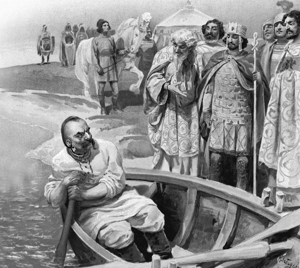 [968 г.] Печенеги напали на Россию, зная отсутствие храброго Князя, и приступили к самому Киеву, где затворилась Ольга с детьми Святослава. На другой стороне Днепра стоял Воевода Российский, именем Претич, с малочисленною дружиною, и не мог иметь с осажденными никакого сообщения. Изнемогая от голода и жажды, Киевляне были в отчаянии. Один смелый отрок вызвался уведомить Претича о бедственном их состоянии; вышел с уздою из города прямо в толпу неприятелей и, говоря языком Печенежским, спрашивал, кто видел его коня? Печенеги, воображая, что он их воин, дали ему дорогу. Отрок спешил к Днепру, сбросил с себя одежду и поплыл. Тут неприятели, узнав свою ошибку, начали стрелять в него; а россияне с другого берега выехали навстречу и взяли отрока в лодку. Слыша от сего посланного, что изнуренные Киевляне хотят на другой день сдаться, и боясь гнева Святославова, Воевода решился спасти хотя семейство Княжеское – и Печенеги на рассвете увидели лодки Российские, плывущие к их берегу с трубным звуком, на который обрадованные жители Киевские ответствовали громкими восклицаниями. Думая, что сам грозный Святослав идет на помощь к осажденным, неприятели рассеялись в ужасе, и Великая Княгиня Ольга могла, вместе со внуками, безопасно встретить своих избавителей за стенами города. Князь Печенежский увидел их малое число, но все еще не смел сразиться: требовал дружелюбного свидания с предводителем Российским и спросил у него, Князь ли он? Хитрый Воевода объявил себя начальником передовой дружины Святославовой, уверяя, что сей Герой со многочисленным войском идет вслед за ним. Обманутый Печенег предложил мир: они подали руку один другому и в знак союза обменялись оружием. Князь дал Воеводе саблю, стрелы и коня: Воевода Князю щит, броню и меч. Тогда Печенеги немедленно удалились от города.
