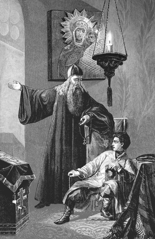 Прошло три дни. Велели собраться двору: Первосвятитель, Бояре, все знатные сановники окружали Иоанна, который, помолчав, сказал Митрополиту: «Уповая на милость Божию и на Святых заступников земли Русской, имею намерение жениться: ты, отче, благословил меня. Первою моею мыслию было искать невесты в иных Царствах; но, рассудив основательнее, отлагаю сию мысль. Во младенчестве лишенный родителей и воспитанный в сиротстве, могу не сойтися нравом с иноземкою: будет ли тогда супружество счастием? Желаю найти невесту в России по воле Божией и твоему благословению». Митрополит с умилением ответствовал: «Сам Бог внушил тебе намерение столь вожделенное для твоих подданных! Благословляю оное именем Отца Небесного». Бояре плакали от радости, как говорит летописец, и с новым восторгом прославили мудрость Державного, когда Иоанн объявил им другое намерение: «еще до своей женитьбы исполнить древний обряд предков его и венчаться на Царство». Он велел Митрополиту и Боярам готовиться к сему великому торжеству, как бы утверждающему печатию Веры святой союз между Государем и народом. Оно было не новое для Московской Державы: Иоанн III венчал своего внука на Царство, но советники Великого Князя – желая или дать более важности сему обряду, или удалить от мыслей горестное воспоминание о судьбе Димитрия Иоанновича – говорили единственно о древнейшем примере Владимира Мономаха, на коего Митрополит Ефесский возложил венец, златую цепь и бармы Константиновы. Писали и рассказывали, что Мономах, умирая, отдал Царскую утварь шестому сыну своему, Георгию; велел только хранить ее как зеницу ока и передавать из рода в род без употребления, доколе Бог не умилостивится над бедною Россиею и не воздвигнет в ней истинного Самодержца, достойного украситься знаками могущества. Сие предание вошло в летописи XVI века, когда Россия действительно увидела Самодержца на троне и Греция, издыхая в бедствии, отказала нам величие своих Царей.