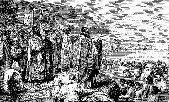 Сего не довольно: Владимир отказался от своего завоевания и, соорудив в Херсоне церковь – на том возвышении, куда граждане сносили из-под стен землю, возвратил сей город Царям Греческим в изъявление благодарности за руку сестры их. Вместо пленников он вывел из Херсона одних Иереев и того Анастаса, который помог ему овладеть городом; вместо дани взял церковные сосуды, мощи Св. Климента и Фива, ученика его, также два истукана и четырех коней медных, в знак любви своей к художествам (сии, может быть, изящные произведения древнего искусства стояли в Несторово время на площади старого Киева, близ нынешней Андреевской и Десятинной церкви). Наставленный Херсонским Митрополитом в тайнах и нравственном учении Христианства, Владимир спешил в столицу свою озарить народ светом крещения. Истребление кумиров служило приуготовлением к сему торжеству: одни были изрублены, другие сожжены. Перуна, главного из них, привязали к хвосту конскому, били тростями и свергнули с горы в Днепр. Чтобы усердные язычники не извлекли идола из реки, воины Княжеские отталкивали его от берегов и проводили до самых порогов, за коими он был извержен волнами на берег (и сие место долго называлось Перуновым). Изумленный народ не смел защитить своих мнимых богов, но проливал слезы, бывшие для них последнею данию суеверия: ибо Владимир на другой день велел объявить в городе, чтобы все люди Русские, Вельможи и рабы, бедные и богатые шли креститься – и народ, уже лишенный предметов древнего обожания, устремился толпами на берег Днепра, рассуждая, что новая Вера должна быть мудрою и святою, когда Великий Князь и Бояре предпочли ее старой Вере отцев своих. Там явился Владимир, провождаемый собором Греческих Священников, и по данному знаку бесчисленное множество людей вступило в реку: большие стояли в воде по грудь и шею; отцы и матери держали младенцев на руках; Иереи читали молитвы крещения и пели славу Вседержителя. Когда же обряд торжественный совершился; когда Священный Собор нарек всех граждан Киевских Христианами: тогда Владимир, в радости и восторге сердца устремив взор на небо, громко произнес молитву: "Творец земли и неба! Благослови сих новых чад Твоих; дай им познать Тебя, Бога истинного, утверди в них Веру правую. Будь мне помощию в искушениях зла, да восхвалю достойно святое имя Твое!"… В сей великий день, говорит Летописец, земля и небо ликовали.