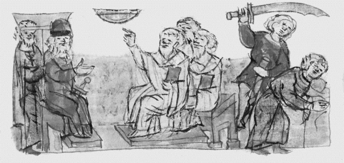 Совет Владимира Святославича с епископами и старцами о наказании разбойников; казнь разбойников по повелению Владимира. Миниатюра из Радзивилловской летописи