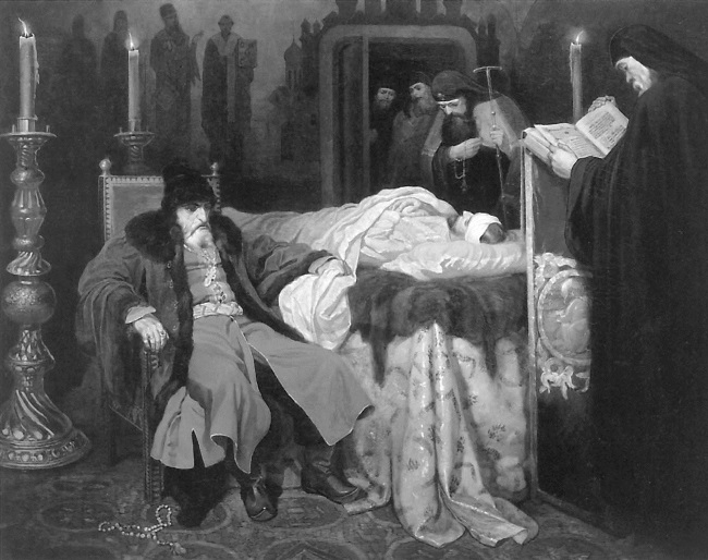 В старшем, любимом сыне своем, Иоанне, Царь готовил России второго себя: вместе с ним занимаясь делами важными, присутствуя в Думе, объезжая Государство, вместе с ним и сластолюбствовал и губил людей как бы для того, чтобы сын не мог стыдить отца и Россия не могла ждать ничего лучшего от наследника. Юный Царевич, не быв вдовцом, имел тогда уже третью супругу, Елену Ивановну, роду Шереметевых: две первые, Сабурова и Параскева Михайловна Соловая, были пострижены. Своевольно или в угодность родителю меняя жен, он еще менял и наложниц, чтобы во всем ему уподобляться. Но, изъявляя страшное в юности ожесточение сердца и необузданность в любострастии, оказывал ум в делах и чувствительность ко славе или хотя к бесславию отечества. Во время переговоров о мире страдая за Россию, читая горесть и на лицах Бояр – слыша, может быть, и всеобщий ропот – Царевич исполнился ревности благородной, пришел к отцу и требовал, чтобы он послал его с войском изгнать неприятеля, освободить Псков, восстановить честь России. Иоанн в волнении гнева закричал: "Мятежник! ты вместе с Боярами хочешь свергнуть меня с престола!" и поднял руку. Борис Годунов хотел удержать ее: Царь дал ему несколько ран острым жезлом своим и сильно ударил им Царевича в голову. Сей несчастный упал, обливаясь кровию. Тут исчезла ярость Иоаннова. Побледнев от ужаса, в трепете, в исступлении он воскликнул: "Я убил сына!" и кинулся обнимать, целовать его; удерживал кровь, текущую из глубокой язвы; плакал, рыдал, звал лекарей; молил Бога о милосердии, сына о прощении. Но Суд Небесный совершился!.. Царевич, лобызая руки отца, нежно изъявлял ему любовь и сострадание; убеждал его не предаваться отчаянию; сказал, что умирает верным сыном и подданным… жил четыре дни и скончался 19 ноября в ужасной Слободе Александровской… Там, где столько лет лилася кровь невинных, Иоанн, обагренный сыновнею, в оцепенении сидел неподвижно у трупа без пищи и сна несколько дней… 22 ноября Вельможи, Бояре, Князья, все в одежде черной, понесли тело в Москву. Царь шел за гробом до самой церкви Св. Михаила Архангела, где указал ему место между памятниками своих предков. Погребение было великолепно и умилительно. Все оплакивали судьбу державного юноши, который мог бы жить для счастия и добродетели, если бы рука отцевская, назло природе, безвременно не ввергнула его и в разврат и в могилу! Человечество торжествовало: оплакивали и самого Иоанна!.. Обнаженный всех знаков Царского сана, в ризе печальной, в виде простого, отчаянного грешника, он бился о гроб и землю с воплем пронзительным.