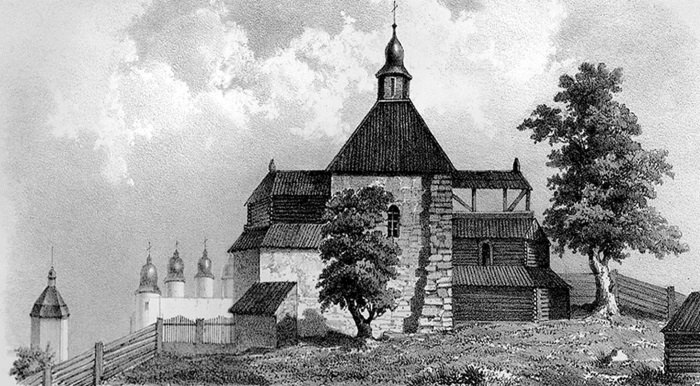 Вид церкви, устроенной из остатков древней Десятинной митрополитом Петром Могилой. Гравюра 1847 г.