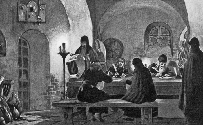 Б. М. Зворыкин. Архимандрит Дионисий диктует инокам Троице-Сергиевой лавры воззвание к народу