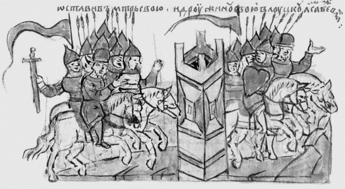 Выступление Ярополка Изяславича Волынского с дружиной против Всеволода Ярославича Киевского и Владимира Всеволодовича Мономаха (Черниговского); бегство Ярополка к полякам. Миниатюра из Радзивилловской летописи