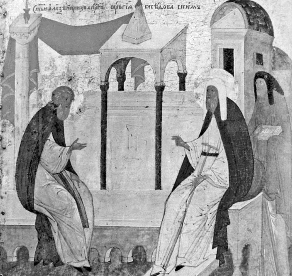 Беседа святителя Алексия с преподобным Сергием. Клеймо иконы XV в.