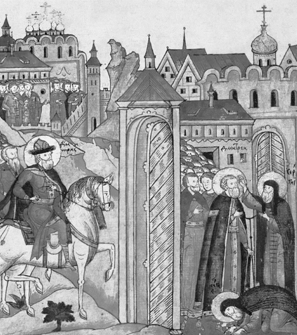 Благословение Димитрия Донского Сергием. Миниатюра из «Жития преподобного Сергия Радонежского». Конец XVI в.