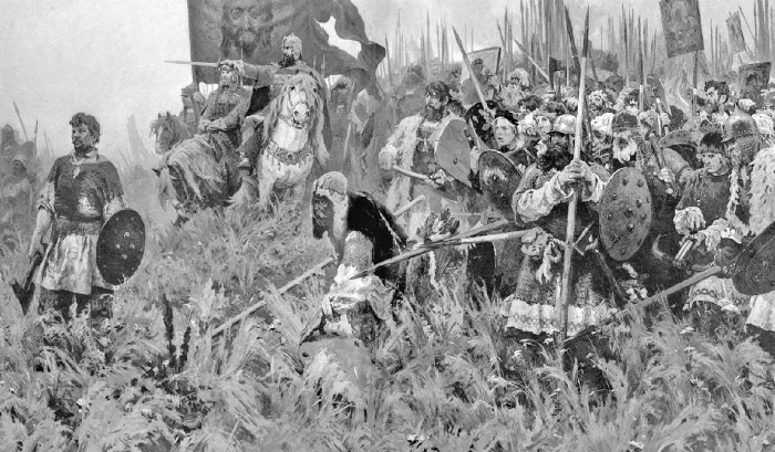 6 сентября войско наше приближилось к Дону, и Князья рассуждали с Боярами, там ли ожидать Моголов, или идти далее? Мысли были несогласны. Ольгердовичи, Князья Литовские, говорили, что надобно оставить реку за собою, дабы удержать робких от бегства; что Ярослав Великий таким образом победил Святополка и Александр Невский Шведов. Еще и другое важнейшее обстоятельство было опорою сего мнения: надлежало предупредить соединение Ягайла с Мамаем. Великий Князь решился – и, к ободрению своему, получил от Св. Сергия письмо, в коем он благословлял его на битву, советуя ему не терять времени. Тогда же пришла весть, что Мамай идет к Дону, ежечасно ожидая Ягайла. Уже легкие наши отряды встречались с Татарскими и гнали их. Димитрий собрал Воевод и, сказав им: «Час суда Божия наступает», 7 сентября велел искать в реке удобного броду для конницы и наводить мосты для пехоты. В следующее утро был густой туман, но скоро рассеялся: войско перешло за Дон и стало на берегах Непрядвы, где Димитрий устроил все полки к битве. В середине находились Князья Литовские, Андрей и Димитрий Ольгердовичи, Феодор Романович Белозерский и Боярин Николай Васильевич; в собственном же полку Великокняжеском Бояре Иоанн Родионович Квашня, Михаил Брянск, Князь Иоанн Васильевич Смоленский; на правом крыле Князь Андрей Феодорович Ростовский, Князь Стародубский того же имени и Боярин Феодор Грунка; на левом Князь Василий Васильевич Ярославский, Феодор Михайлович Моложский и Боярин Лев Морозов; в сторожевом полку Боярин Михаил Иоаннович, внук Акинфов, Князь Симеон Константинович Оболенский, брат его Князь Иоанн Торусский и Андрей Серкиз; а в засаде Князь Владимир Андреевич, внук Калитин, Димитрий Михайлович Волынский, победитель Олега и Болгаров, муж славный доблестию и разумом, – Роман Михайлович Брянский, Василий Михайлович Кашинский и сын Романа Новосильского. Димитрий, стоя на высоком холме и видя стройные, необозримые ряды войска, бесчисленные знамена, развеваемые легким ветром, блеск оружия и доспехов, озаряемых осенним солнцем, – слыша всеобщие громогласные восклицания: «Боже! даруй победу Государю нашему!» и вообразив, что многие тысячи сих бодрых витязей падут чрез несколько часов, как усердные жертвы любви к отечеству, Димитрий в умилении преклонил колена и, простирая руки к златому образу Спасителя, сиявшему вдали на черном знамени Великокняжеском, молился в последний раз за Христиан и Россию; сел на коня, объехал все полки и говорил речь к каждому, называя воинов своими верными товарищами и милыми братьями, утверждая их в мужестве и каждому из них обещая славную память в мире, с венцом мученическим за гробом.