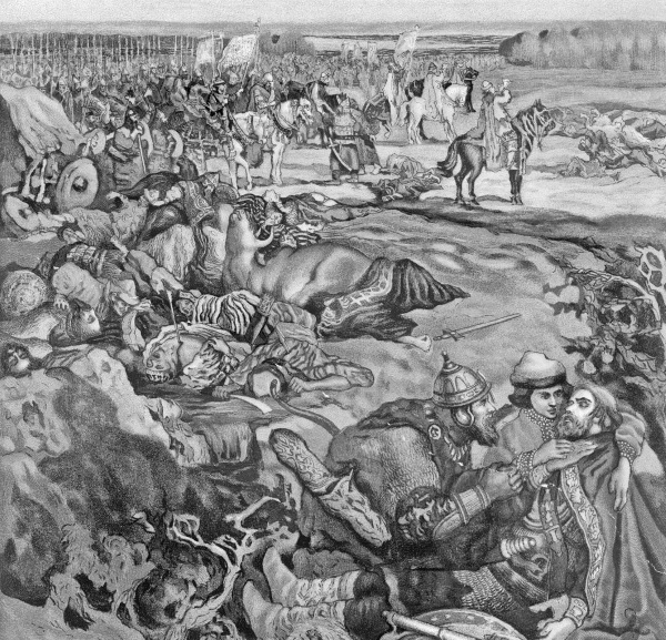 Мужественный Князь Владимир, Герой сего незабвенного для России дня, довершив победу, стал на костях, или на поле битвы, под черным знаменем Княжеским и велел трубить в воинские трубы: со всех сторон съезжались к нему Князья и полководцы, но Димитрия не было. Изумленный Владимир спрашивал: «Где брат мой и первоначальник нашей славы?» Никто не мог дать об нем вести. В беспокойстве, в ужасе Воеводы рассеялись искать его, живого или мертвого; долго не находили: наконец два воина увидели великого Князя, лежащего под срубленным деревом. Оглушенный в битве сильным ударом, он упал с коня, обеспамятел и казался мертвым; но скоро открыл глаза. Тогда Владимир, Князья, чиновники, преклонив колена, воскликнули единогласно: «Государь! ты победил врагов!» Димитрий встал: видя брата, видя радостные лица окружающих его и знамена Христианские над трупами Моголов, в восторге сердца изъявил благодарность Небу; обнял Владимира, чиновников; целовал самых простых воинов и сел на коня, здравый веселием духа и не чувствуя изнурения сил. – Шлем и латы его были иссечены, но обагрены единственно кровию неверных: Бог чудесным образом спас сего Князя среди бесчисленных опасностей, коим он с излишнею пылкостию подвергался, сражаясь в толпе неприятелей и часто оставляя за собою дружину свою. Димитрий, провождаемый Князьями и Боярами, объехал поле Куликово, где легло множество россиян, но вчетверо более неприятелей, так, что, по сказанию некоторых Историков, число всех убитых простиралось до двухсот тысяч. Князья Белозерские, Феодор и сын его Иоанн, Торусские Феодор и Мстислав, Дорогобужский Димитрий Монастырев, первостепенные Бояре Симеон Михайлович, сын Тысячского Николай Васильевич, внук Акинфов Михаил, Андрей Серкиз, Волуй, Бренко, Лев Морозов и многие другие положили головы за отечество: а в числе их и Сергиев Инок Александр Пересвет, о коем пишут, что он еще до начала битвы пал в единоборстве с Печенегом, богатырем Мамаевым, сразив его с коня и вместе с ним испустив дух; кости сего и другого Сергиева Священновитязя, Осляби, покоятся доныне близ монастыря Симонова. Останавливаясь над трупами мужей знаменитейших, Великий Князь платил им дань слезами умиления и хвалою; наконец, окруженный Воеводами, торжественно благодарил их за оказанное мужество, обещая наградить каждого по достоинству, и велел хоронить тела россиян. После, в знак признательности к добрым сподвижникам, там убиенным, он уставил праздновать вечно их память в Субботу Дмитровскую, доколе существует Россия.