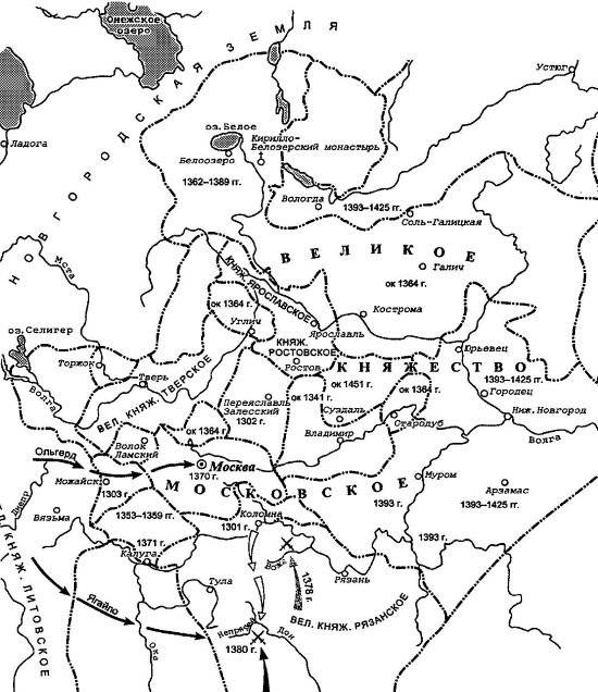 Уже зная всю черноту души Олеговой и сведав еще, что сей изменник старался вредить Московским полкам на возвратном их пути чрез области Рязанские, истреблял мосты, даже захватывал и грабил слуг Великокняжеских, Димитрий готовился наказать его. Тогда именитейшие Бояре Рязанские приехали в Москву объявить, что Князь их ушел с своим семейством и двором в Литву; что Рязань поддается Герою Донскому и молит его о милосердии. Димитрий отправил туда Московских Наместников; но хитрый Олег, быв несколько месяцев изгнанником, умел тронуть его чувствительность знаками раскаяния и возвратился на престол, с обещанием отказаться от Ягайловой дружбы, считать Великого Князя старшим братом и быть с ним заодно в случае войны или мира с Литвою и Татарами. В сем письменном договоре сказано, что Ока и Цна служат границею между княжениями Московским и Рязанским; что места, отнятые у Татар, бесспорно принадлежат тому, кто их отнял; что город Тула, названный именем Царицы Тайдулы, жены Чанибековой, и некогда управляемый ее Баскаками, остается собственностию Димитрия, равно как и бывшая Мордовская область, Мещера, купленная им у тамошнего крещеного Князя, именем Александра Уковича. Великодушие действует только на великодушных: суровый Олег мог помнить обиды, а не благотворения; скоро забыл милость Димитрия и воспользовался первым случаем нанести ему вред.