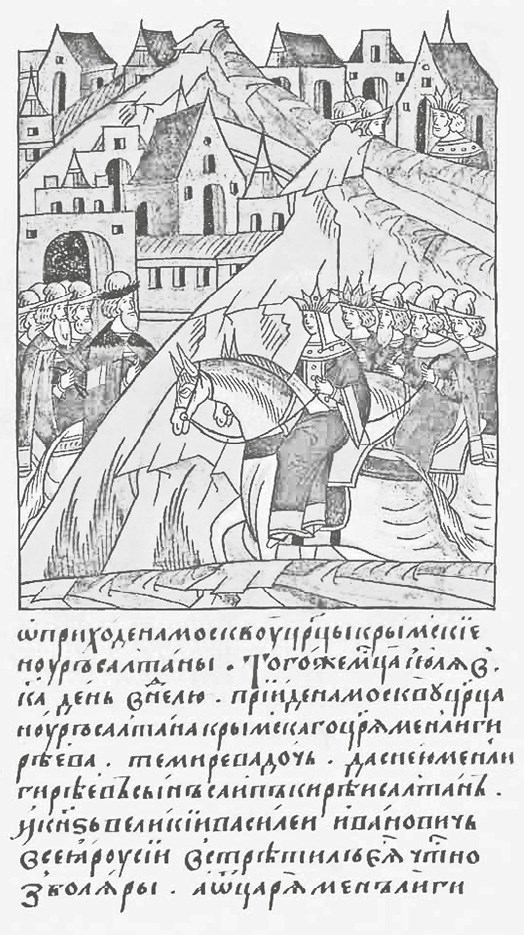 Менгли-Гирей с царицей Нур-Салтан приезжают в Москву. Лицевой летописный свод. XVI в.