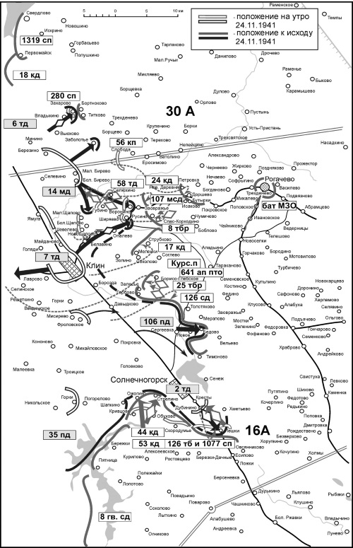 В неразберихе, возникшей между Клином и Солнечногорском, 2-я тд врага захватила карту зоны заграждений, которую вез офицер связи из штаба 30-й А в штаб 16-й[42]. Документ немедленно размножили и разослали подчиненным, соседям, а также специальным самолетом высшему командованию.