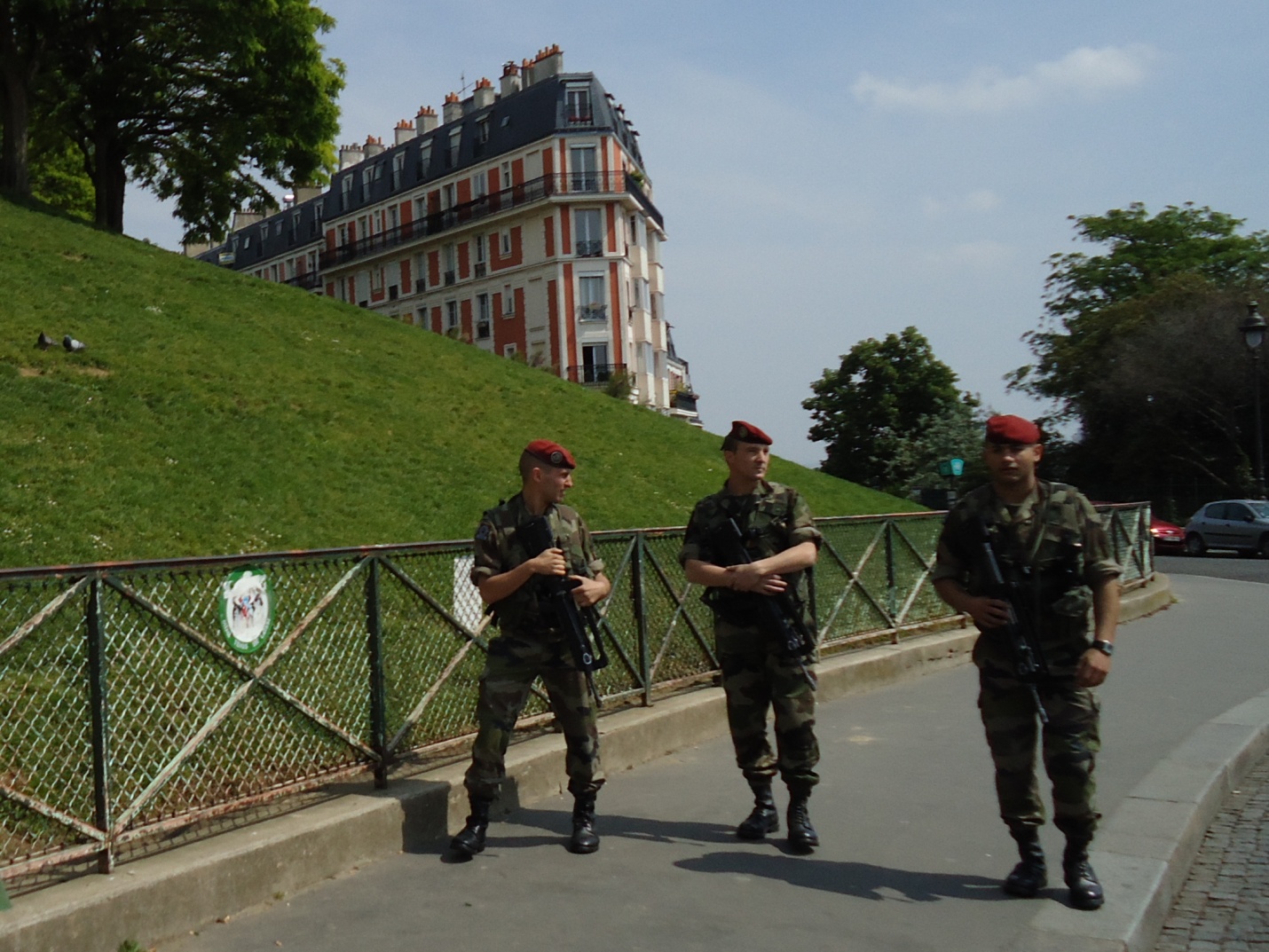 Военный патруль на улицах Парижа (терактов в «Батаклане» и в брюссельском аэропорту ещё не было, патрули уже ходили, но оказывали только моральное воздействие)