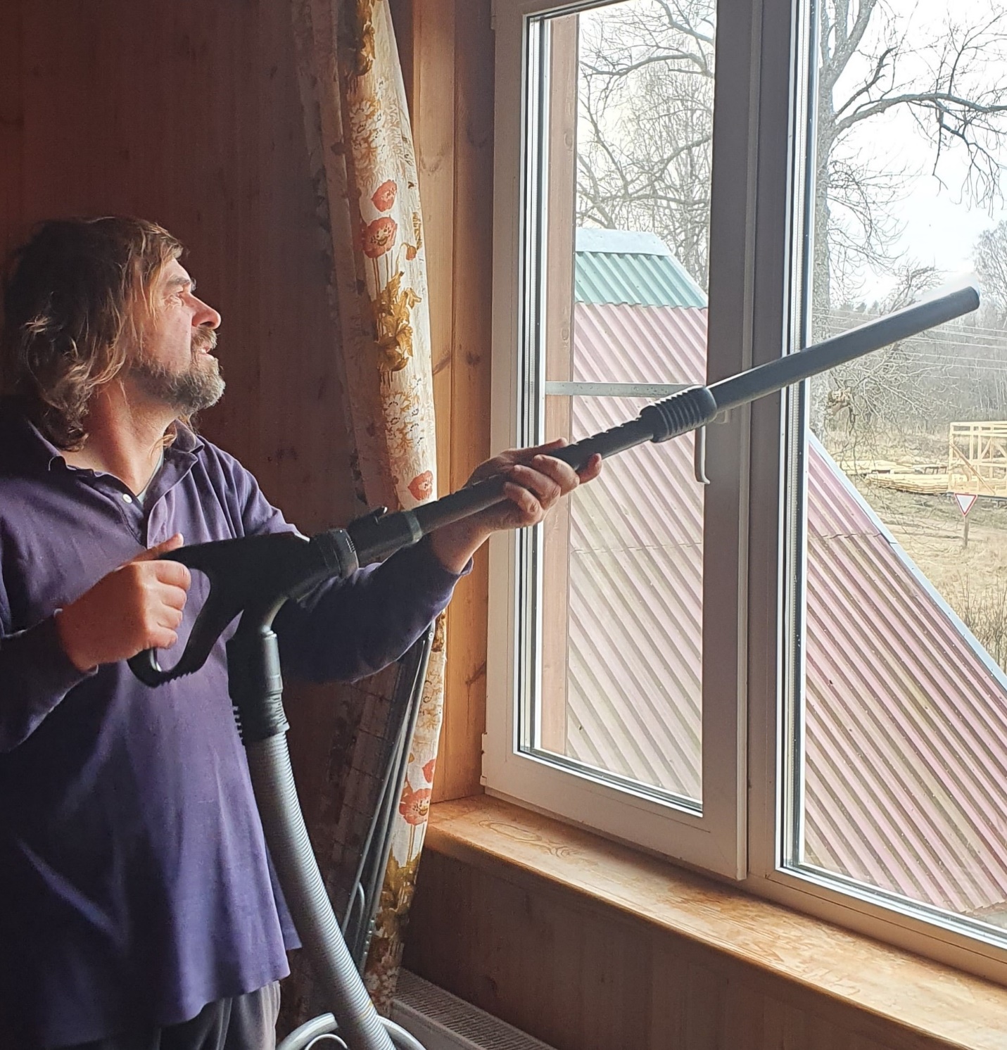 Потом ещё раз им обжиматься пришлось, потому что с первого раза что-то не так получилось. Но это в порядке иллюстрации, а так дел много. Вот фотография, стою я и держу шланг от пылесоса, тыкаю им в окно.