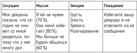 Из таблицы можно увидеть, что ваши негативные мысли привели вас к негативным эмоциям, а затем и к поведению, точнее, к избеганию вашей девушки. Стоит также уточнить, что проценты около мыслей – это ваша уверенность в ней на тот момент, когда она появилась. Потому что многие мысли могут просто проноситься в нашей голове, но мы с вами можем не придавать им какого-то значения.