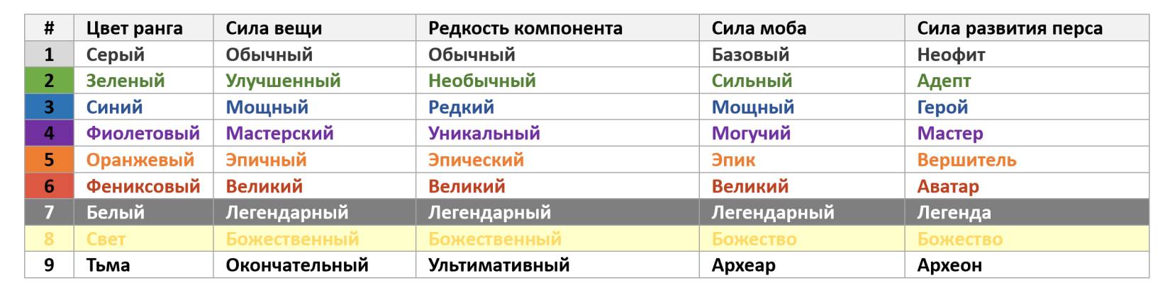 Значит, обычные вещи и компоненты в системе отмечаются серым цветом, а необычные зелёным. Ради любопытства я взглянул на справку по всем рангам, и увидел, что всего их девять.