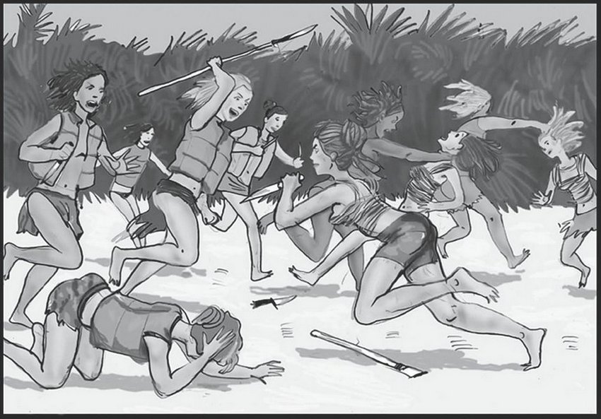 На следующий день, заряженные энергией мяса и уверенные в успехе, мы выстроились «свиньей» и ринулись на деморализованного и истощенного противника. Войско Гретты выстроилось во фронт. Ее воины были оснащены щитами и шлемами, сплетенными из прутьев, торсы защищали потрепанные оранжевые бывшие спасательные жилеты. У каждой были копья и дубины. «Красная армия», как мы окрестили немцев и их союзников из-за цвета жилетов, выдержала первый удар, поставив в центре несгибаемых самураев.