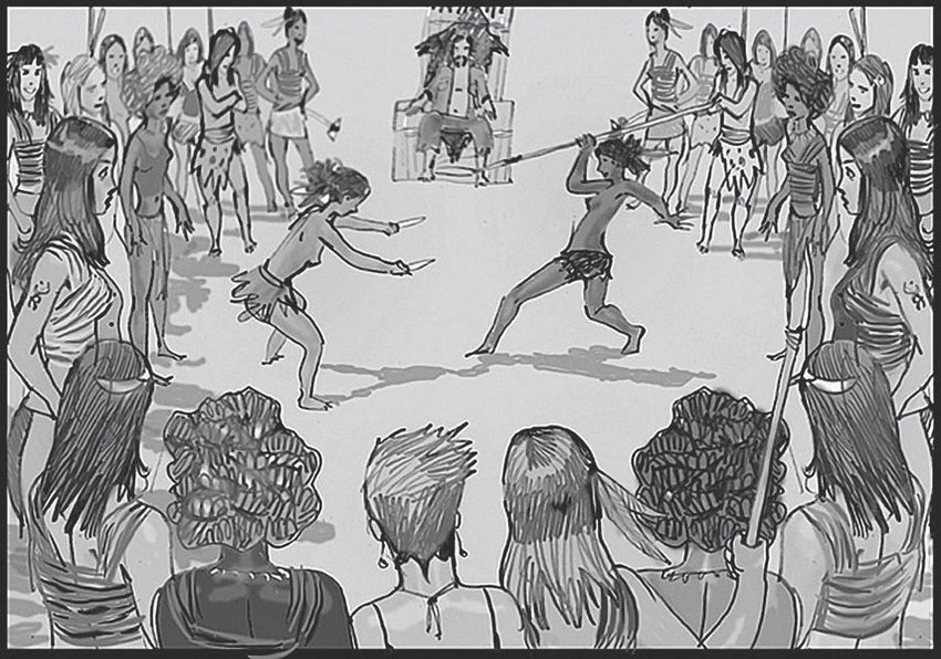 Все расступились, оставив место для поединка. Пленницам перевели смысл моих слов и выдали по тростниковому щиту, металлическому ножу и копью.