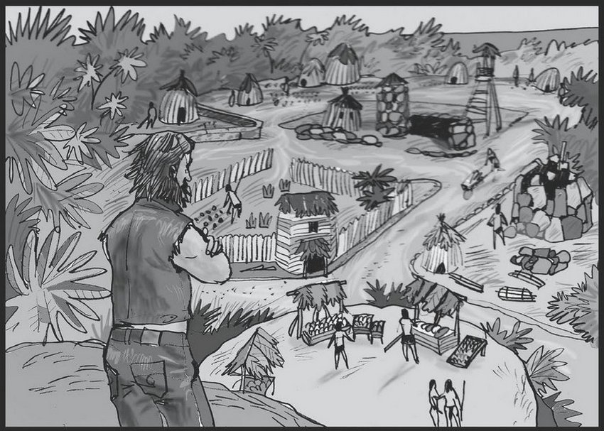 За два отпущенных нам дня из бамбука выросли стены вокруг, наскоро сооруженных, хижин моих воинов. Подходы к лагерю ощетинились острыми колючками кактусов и расщепленными стволами бамбука, вертикально и под углом воткнутыми в землю. Наверху и у подъема стояли дозорные. Войско вооружалось острыми палками с обожженными концами, заостренными под копья, каменными топорами и просто камнями. Я руководил всем этим процессом, давая ценные указания фортификационного строительства и оснащения оружием.