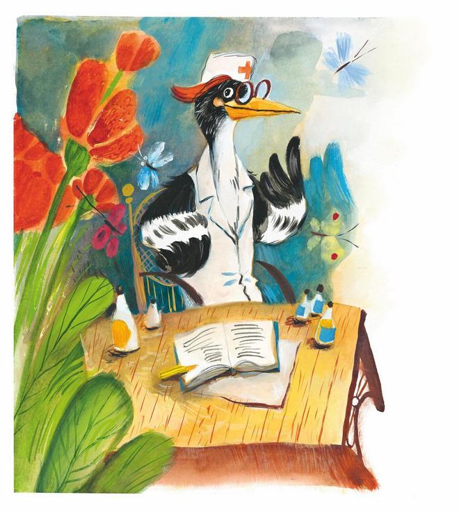 Доктор, красноголовый дятел Иннокентий, встретил посетителей приветливо. Он был в белом халате, на голове – белая шапочка, на носу – роговые очки, в кармане халата – трубка для выслушивания – «дышите, не дышите». Рядом на столике громоздились бутылочки с микстурой, баночки с мазью, коробочки с таблетками и, что больше всего напугало зайчонка Кузю, – инструменты, от одного взгляда на которые Кузино сердце – тук-тук-тук-тук-тук! – бешено заколотилось, уши задрожали, глаза заморгали. И доктор Иннокентий сразу понял, с каким больным он имеет дело.