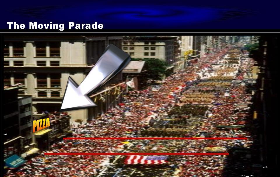 Представьте себе нескончаемый парад людей, идущих мимо вашего ресторана. Некоторые из них хотят, чтобы вы предложили им что-то – прямо сейчас, некоторые – в ближайшую пятницу, другие – в следующем месяце. А некоторые подождут до следующей среды. Или до зарплаты. Или, когда их компания придет в этот город. Или на день рождения. Или на какие-то особые случаи. Вы должны получить место рядом с этим бесконечным парадом. Вы должны постоянно держать свою рекламу перед ними. Вы уверены, что заарканили уже всех? А как насчет всех новых людей, проходящих мимо? Вот рисунок для подтверждения моей точки зрения.