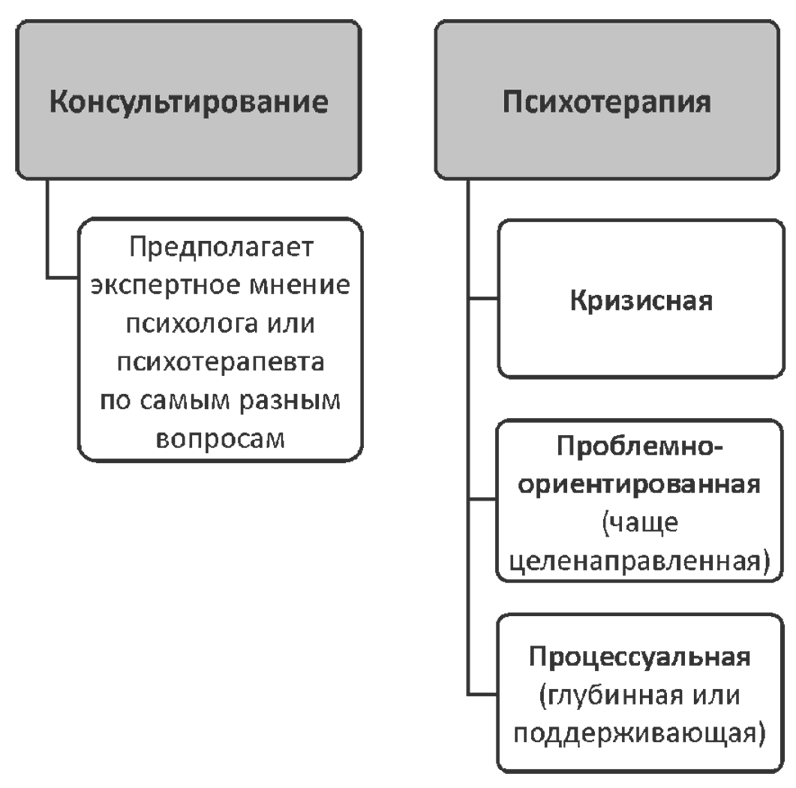 Психотерапевтическая помощь в целом разнообразнее консультативной. В самом общем виде психотерапевтический уровень включает три дополнительных: