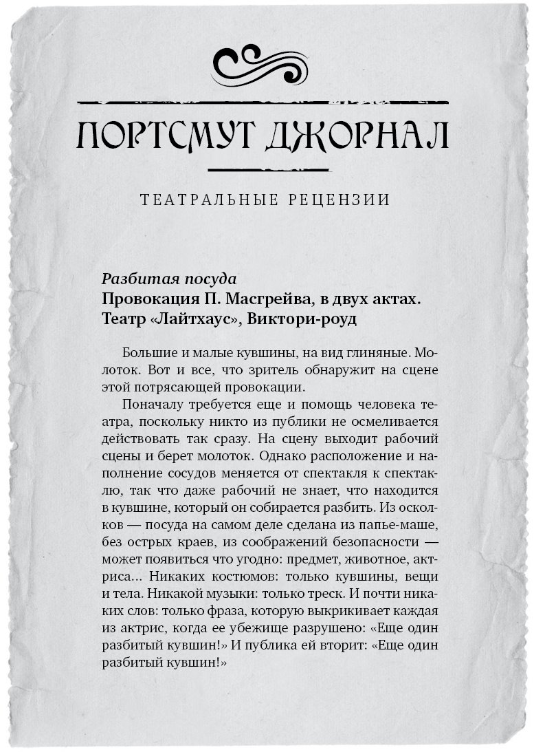 Когда мы поравнялись с театром «Лайтхаус», я заметил, что в городе снова ставят «Разбитую посуду» – провокационную пьесу, имевшую шумный успех: на афише была изображена амфора, из горлышка высовывалась голая детская ручонка. «Разбей свой сосуд!» – призывали большие буквы. Я не видел эту постановку, мне не по душе скандальности, но меня взволновала сама эта афиша с тревожной надписью, так что я не заметил, когда мой извозчик, не желая продираться сквозь публику, приобретающую билеты заранее, свернул в переулок и подстегнул лошадей. А потом я услышал ржание, а потом затряслась вся карета…