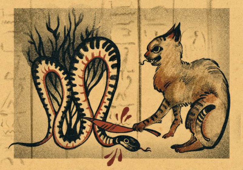 Ра в образе кота, убивающего змея Апопа. Иллюстрация фрагмента виньетки «Книги мертвых» Хунефера