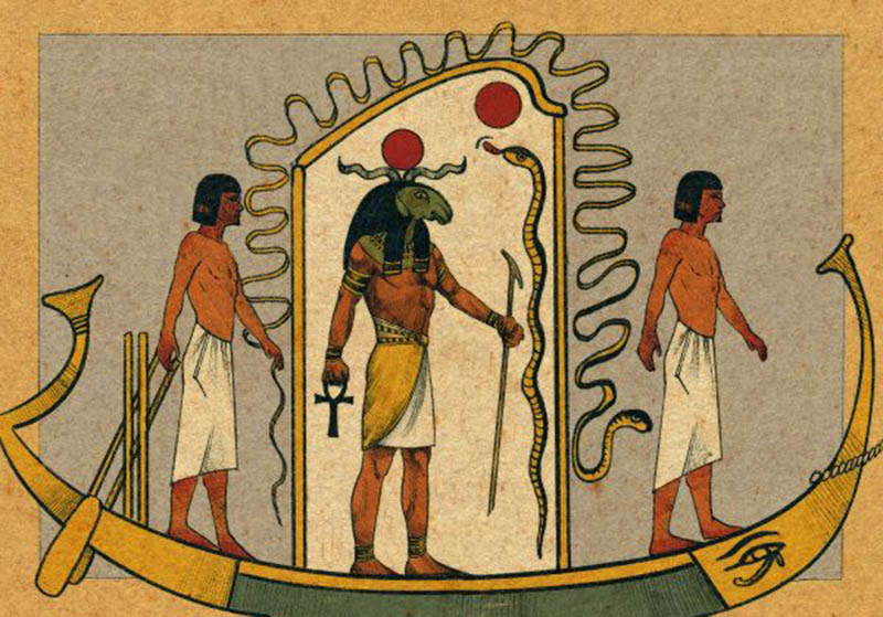 Бараноголовый Ра, плывущий в ладье, в сопровождении Сиа и Хека. Иллюстрация росписи из гробницы Рамсеса I