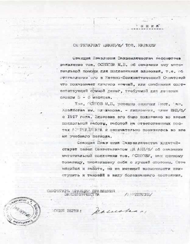 Копия телеграммы о трагической смерти М. Б. Осипова