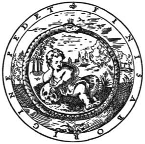 Змея, кусающая свой хвост – та же окружность с выделенной точкой «голова-хвост» или «начало-конец». Эта формула применялась и в греческой философии. Так в «Законах» Платона устами некоего афинянина говорится: «Бог, согласно древнему сказанию, держит начало, конец и середину всего сущего».