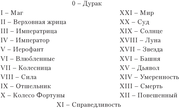 Таким образом получается схема, в которой 22 Аркана Таро распределяются в две колонки: левую (с I по X Аркан) и правую (с XII по XXI Аркан). Нулевой и XI Аркан занимают срединное положение: 0. Дурак – сверху, XI. Справедливость – снизу. Эта схема распределения Арканов необходима для того, чтобы понять многие скрытые смыслы, заключённые в каждом Аркане, их взаимосвязи и аспекты магии.