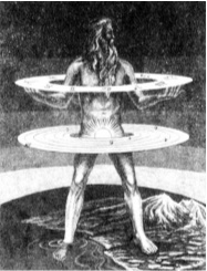 Космический Адам. Когда Адам лежал, голова его «упиралась» в край земли на Востоке, а ноги – на Западе. Когда же Адам вставал, то все твари почитали этого исполина равным Богу. Голова Адама – небо о семи сферах (семь тонких слоев Земли-Алес); тело его – земля, волосы – деревья, кости и жилы – горы и реки. А обращение пищи в животе Адама – смена времен года. Потом Бог Яхве снова уменьшил тело Адама.