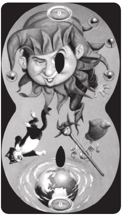 Карта изображает юношу в одежде шута, парящего над земным шаром, для которого, как говорится в инструкции к Таро Бесконечности, «Путешествие в Бесконечность начинается с правильной оценки своего внутреннего потенциала и открывающихся возможностей, которые предоставляет нам Вселенная в виде первобытного хаоса». Это значение также соответствует нашей Задаче.