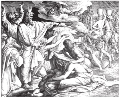 Кратко перечислим некоторые из чудес. Когда Моисей клал руку за пазуху и вынимал её, она становилась белой от проказы, когда он снова прятал руку за пазуху и вынимал её – она становилась здоровой. Моисей наслал на египетского фараона и его народ семь язв: превратил воды Нила в кровь; устроил нашествие жаб; насылал сначала «скнипов» (комаров или паразитов), потом на людей и их скот «песьих мух»; затем тяжкие язвы, и следом лихорадку. Устроил град, побивший всё под небом, и огонь между градом (по некоторым толкованиям – хамсин, южный палящий ветер); затем нашествие саранчи и гусениц, а в завершении густую тьму в течение трёх дней, затмившую солнце (Исх.7–10).