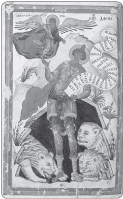 Иллюстрация, происхождение которой не установлено, поражает своим сходством по форме и стилю, с одной стороны, с иконой; с другой стороны – с картой Таро. Здесь Даниил сближен с традиционным обликом Иисуса Христа и уже имеет классический нимб вокруг головы, которого в ранних изображениях нет.