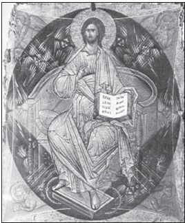 Традиционная интерпретация символов иконы, приведённая в специальной христианской литературе, гласит, что геометрические фигуры представляют собой Вселенную, где центр – это Иисус Христос. Он находится в спасительном огне, обозначенном на иконе в виде красного ромба. Бесконечность бытия олицетворяет синий овал – это сфера Небесного Царствия, символ духовности. Земля на иконе изображается в форме красного квадрата. В этой равносторонней фигуре четыре угла служат символом четырех Стихий, из которых строится Земля: Воздух, Вода, Земля и Огонь, которых олицетворяет Тетраграмматон.