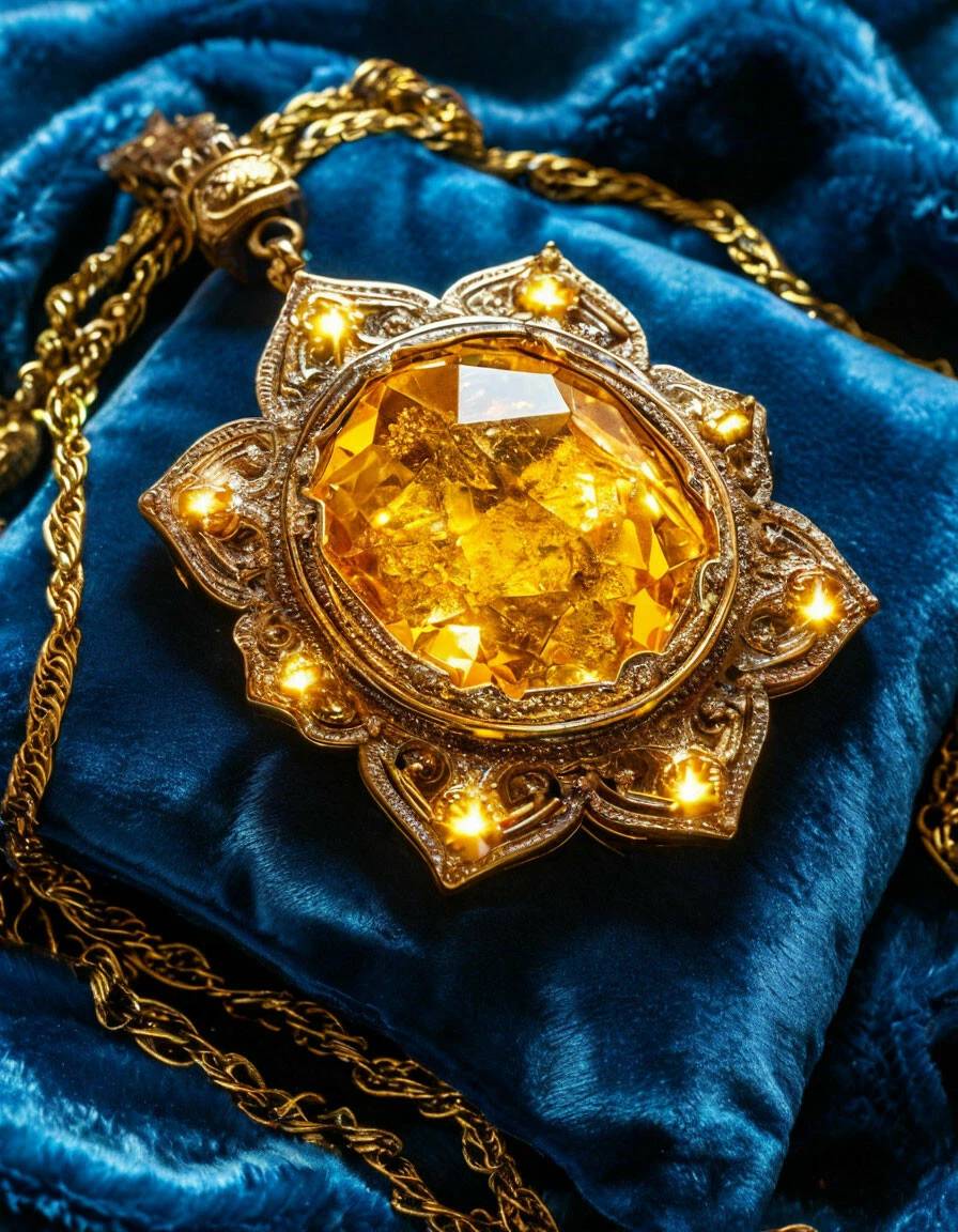 Я открыла шкатулку, взяв её за более целый краешек. И замерла. Внутри на бархатной синей подушке лежал медальон с длинной цепочкой. Медальон в форме солнца, где от круга расходились лучи-лепестки. В центре был крупный ослепительно жёлтый камень, вновь навевающий ассоциации с солнцем. Он ярко переливался более светлыми сияющими искорками. На каждом луче-лепестке мерцали те же самые камни, но гораздо меньшего размера.