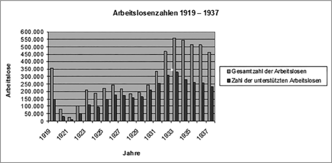 War die Zahl der Arbeitslosen kurz nach dem Ende des Ersten Weltkrieges auf über 350.000 angeschwollen, so fiel sie in den beiden nachfolgenden Jahren deutlich auf 78.000 (1920) und 28.000 (1921). Diese sehr erfreuliche Entwicklung hielt jedoch nicht an und in den Jahren bis 1930 lag die Arbeitslosenrate zwischen 8,3 und 11,2 %, danach stieg sie sprunghaft an, lag 1932 bereits bei 21,7 % und erreichte 1933 ihren Höchstwert mit 26 %. Im Jahr 1937 lag die Arbeitslosenrate noch immer bei 21,7 % oder 464.000 Personen, von denen nur 231.320 Personen Arbeitslosenunterstützung erhielten – der Rest galt als „ausgesteuert“ und hatte somit keinerlei Unterstützungsanspruch.99