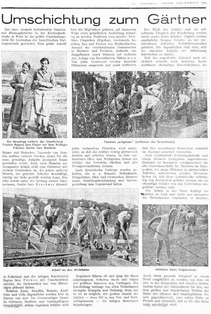 „Die plötzliche Einstellung der Umschulungskurse bedeutete nicht nur für die Kursteilnehmer und Kursleiter einen sehr schweren Schlag, sondern sie wirkte sich für die gesamte Judenschaft von grösstem Nachteil aus. Zur Zeit ihrer Gründung war der ausschließliche Zweck der Umschulung, den Auswanderungswilligen für ihr Leben im neuen Land durch Erlernung manueller Berufe eine Existenzgrundlage zu schaffen. Durch die Umschulung wurden viele Tausende, die unglücklich, aus dem Gleis geworfen, ihre ganze Kraft verloren hatten, wieder aufgerichtet und gestählt. […] Als mit Kriegsbeginn im Jahre 1939 die bis dahin flüssige Auswanderung etwas ins Stocken geriet, war es wieder die Umschulung, welche der ostmärkischen Judenschaft über diese schwere Zeit hinweghalf. Die Umschichtungswilligen besuchten die Kurse in Massen und blieben solange Kursteilnehmer, bis sie zur Ausreise gelangten, die Mehrzahl aber verblieb bis zur erfolgten behördlichen Sperre. […] In den Gartenbaukursen wurden auf drei Plätzen die Grabelandaktion der Umschulung der I.K.G. geführt, wodurch die Fürsorgeanstalten zusätzlich mit frischem Gemüse beliefert werden konnten. Wenn sich die Quantitäten im Verhältnis zum Verbrauch der Wirtschaftsstelle auch nicht besonders auswirkten, so war es dennoch wichtig, dass laufend zirka 150 Erwachsene und 200 Jugendliche beschäftigt und dem Gärtnerberuf zugeführt wurden. […] Zahlreiche Betriebsführer verlangten direkt von der Umschichtungsleitung Arbeitskräfte und jedem Wunsche konnte raschest Rechnung getragen werden. […] Die Leitung der Umschulung stellte das Büro darauf um und war stets bedacht, diese Arbeitskolonnen immer aufzufüllen, für jeden Abgang guten Ersatz zu schaffen. […] Die Bildung von Arbeitskolonnen ist aber auch im Interesse der I.K.G. gelegen, weil sie unerlässlich ist, denn sie würde ein weiteres Herabsinken und eine weitere Verelendung unserer Glaubensbrüder unbedingt verhüten.“285