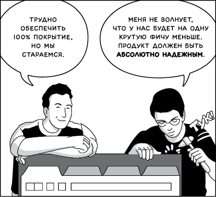 Наш подход к созданию продуктов подразумевает слияние разработки и тестирования. Это подтверждают комментарии к коду типа «где твои тесты, чувак?», развешенные в туалетах плакаты с правилами тестирования[7] и многое другое. Тестирование должно стать неотделимым от разработки. Качество родится только тогда, когда разработка и тестирование начнут жить вместе.