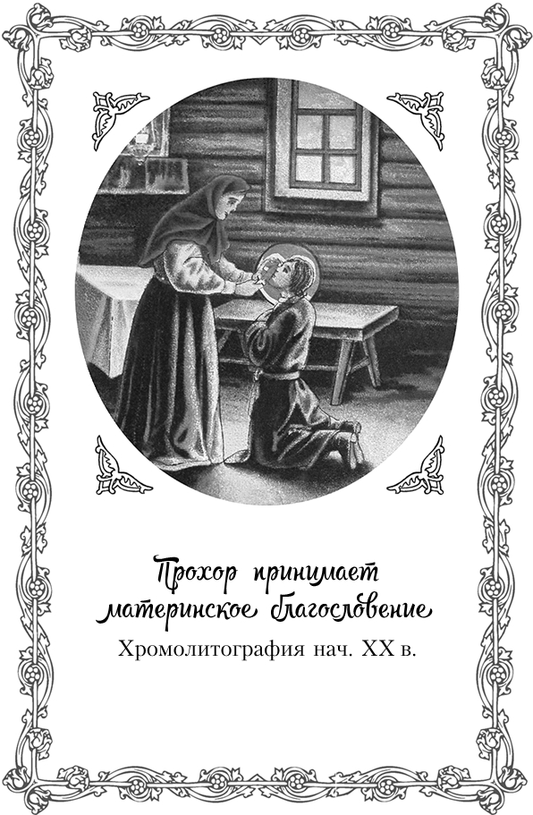 – Милый сын, это благое желание. Благослови тебя Господи исполнять волю Его святую! В эту ночь она совсем не спала. Всё молилась Премилосердной Богородице, вверяя Царице Небесной своё дорогое чадо, да собирала нехитрую снедь в путь-дороженьку. Несколько раз она неслышно подходила к кровати, на которой почивал сынок, и, любуясь родным лицом, вздыхала: «Вот и возмужал мой Прошенька». Засветло пробудился и Прохор. Усердно помолившись Господу, встал он перед матушкой на колени. И Агафья Фотиевна, взяв с полочки семейную реликвию, большое медное распятие, сотворила им крестное знамение, благословив сына в дальнюю дорогу: