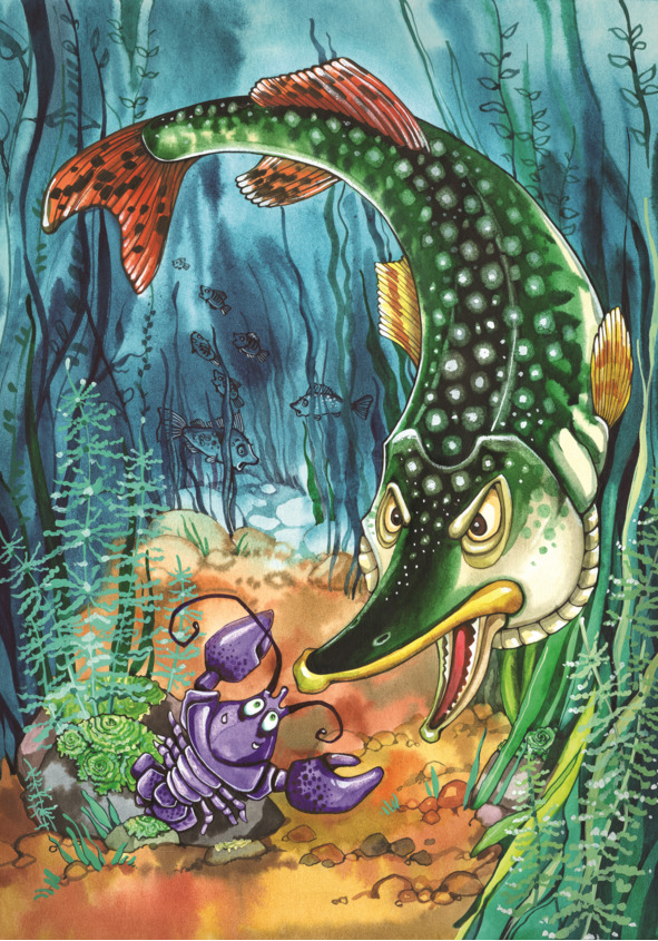 Однако досадовать на маленькую форель пришлось недолго. Пятнистое бревно, за которое он все еще цеплялся клешнями, разинуло огромную пасть с густым частоколом острых и длинных как иглы зубов. Это была коварная, прожорливая щука Клацка.