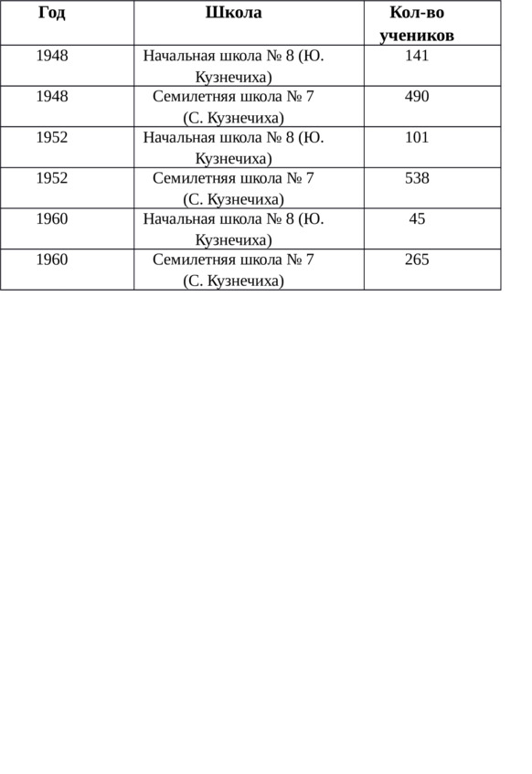 Интересно, что на 1938 год в Кузнечихинской неполной средней школе, согласно кыштымской газете «За цветные металлы», воспитательная работа и образовательная деятельность были поставлены плохо, а также страдала дисциплина. Впоследствии во всех школах посёлка удалось навести порядок. В местной школе учились дети не только с Кузнечихи, а также с Маука, а в годы Великой Отечественной войны и дети немецких переселенцев.