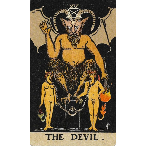 Общее значение. Карточный образ привязанностей, иллюзий и материальных ловушек. Указывает на зависимость, страхи, искушения и необходимость осознать свои ограничения.