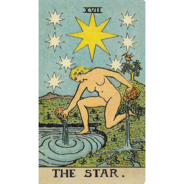 Звезда приходит после Башни, символизируя очищение, надежду и свет. Это момент восстановления после разрушения, когда душа обнажена и готова принять истинный свет. Аркан говорит о внутреннем свете, исцелении, высшем доверии и пути к подлинной духовности. Звезда – это компас души, зов Духа, следование которому даёт спокойствие и веру.