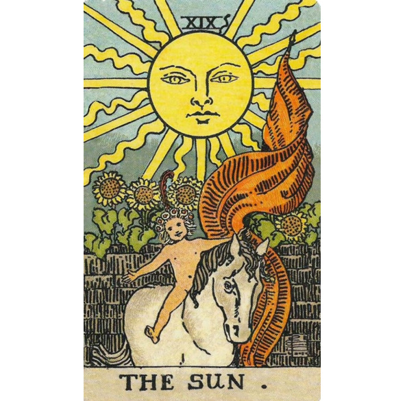 – Солнце – главный элемент карты, символизирует свет, радость, откровение, ясность, сознание и Божественный разум. Оно освещает всё, выжигает иллюзии и дарует тепло.