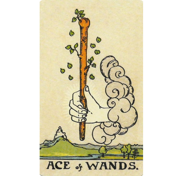 Символы: Рука, выходящая из облаков, предлагает пылающий жезл – символ дарованного потенциала и начала. Сам жезл покрыт зелёными ростками, что указывает на рост, идеи и развитие.