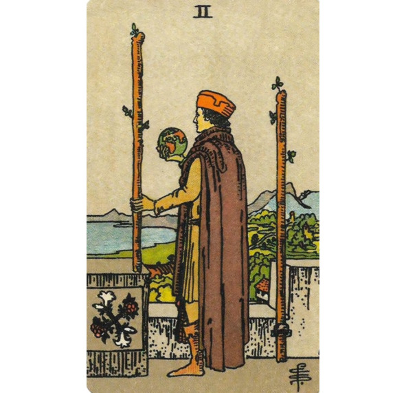 Глифы и детали: Жезлы воткнуты в землю – символ стабильности и устойчивой позиции. Один жезл в руке – готовность к действию. Положение фигуры – уверенность в будущем, перспектива.